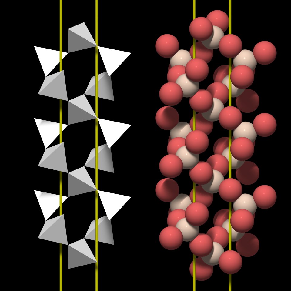 Each SiO4 tetrahedron is member of 2 threefold and 2 sixfold helices.